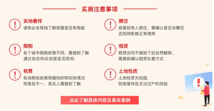 一定要注意房屋情况,如果房屋在拍卖前带有租约,有租客居住,则租约继续有效,必须要等到租约到期才能收回房子。万一签了个10年20年的,要么赔违约金,要么就只是买回一张纸。